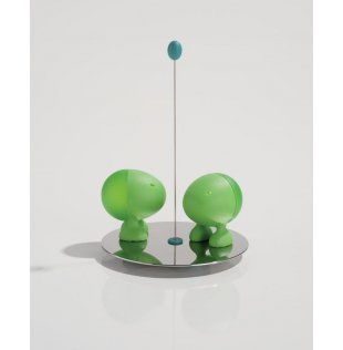The little plastic characters have magnetic feet, so they can attach to the polished stainless steel base or post. A little whimsey at the table never hurt!